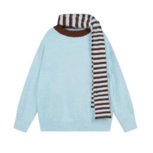 Light Blue Sweater With A Brown Striped Scarf