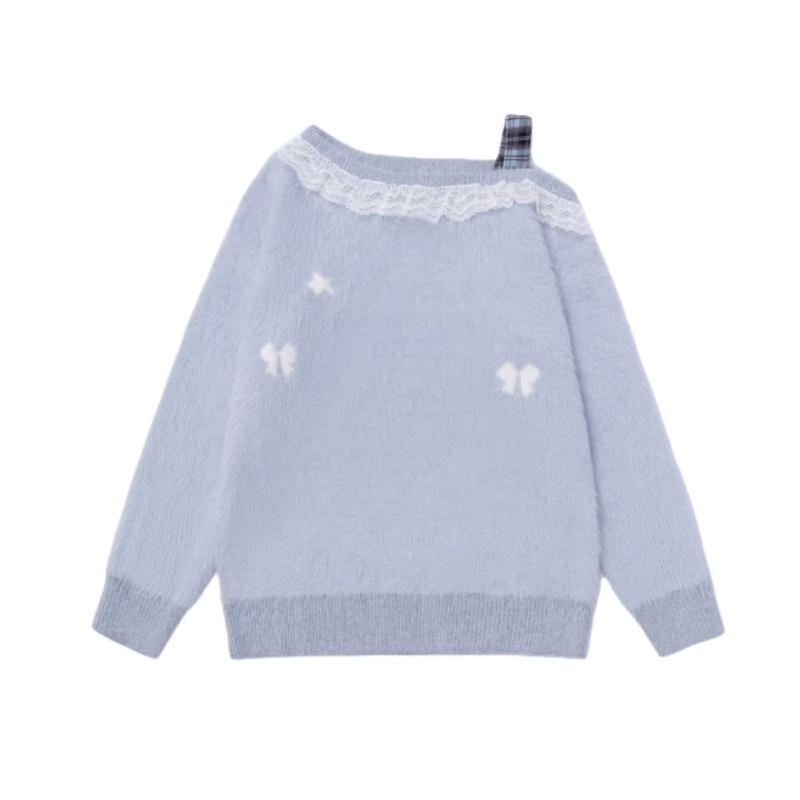 Plaid Lace Off-Shoulder Light Purple Sweater